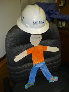 On Monday, January 29, Mommy took Flat Stanley with her to work. She is an engineer and sometimes has to wear a hard hat. Flat asked if he could try, and of course Mommy said yes. He also took a picture drinking coffee, because Mommy couldn't start her day without it.